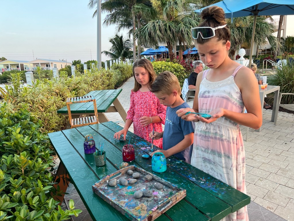 So here is what our trip looked like, if you want to go on a similar vacation. First off, we flew into Miami (you can fly into the keys directly, but it is more expensive and the drive is beautiful). The first day we drove to Marathon Florida and stayed at Courtyard Faro Blanco Resort (2146 Overseas Highway, Marathon, FL, USA 33050) https://www.marriott.com/en-us/hotels/mthmc-courtyard-faro-blanco-resort/photos/ It is a Marriott property and I am a loyal customer and advocate of Marriott. My husband and I both have the Bonvoy Marriott card and earn points, particularly for trips like this. This property was on the water, had a tiki torch ceremony, rock paintings for the kids (which we have kept pictures of, so we can find our rocks when we return again-hopefully SOON!) and so many amazing amenities. There was a restaurant on property https://www.bluewatersbarandgrill.com/ that was perfect for allowing us to stay in and relax our first night there, a pool that overlooked the gulf and white sands steps from the pool and best of all, it is walking distance to one of my favorite aspects of this trip; the Turtle Hospital https://www.turtlehospital.org/ (we will discuss a bit more about this, soon).