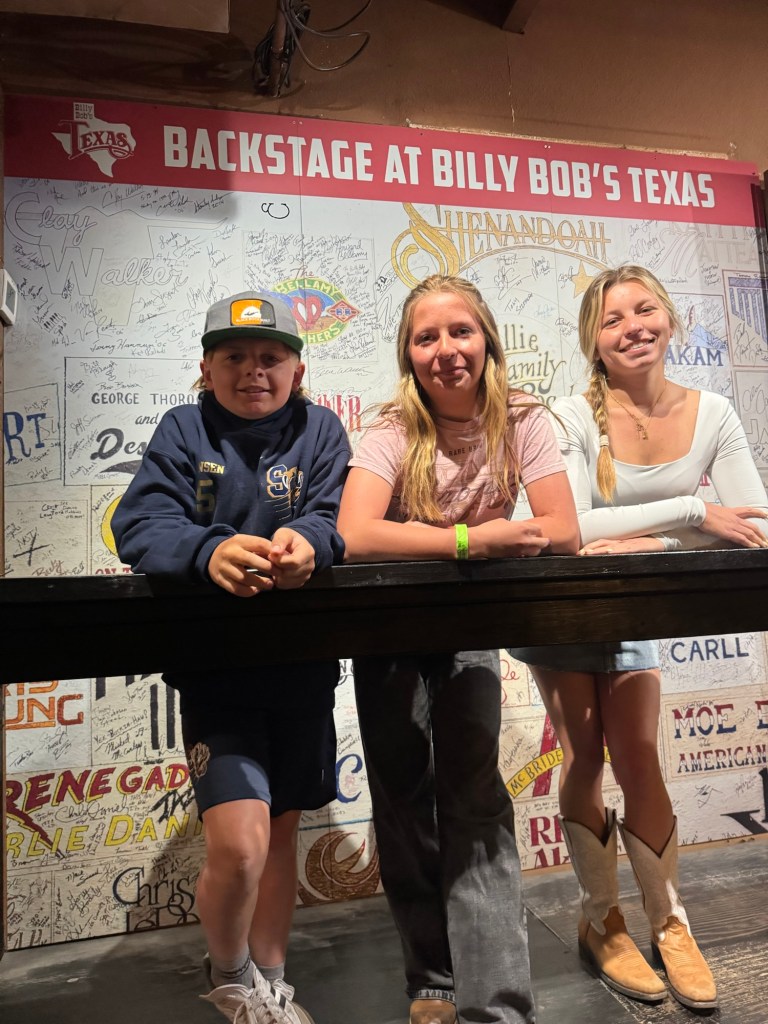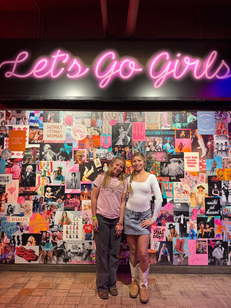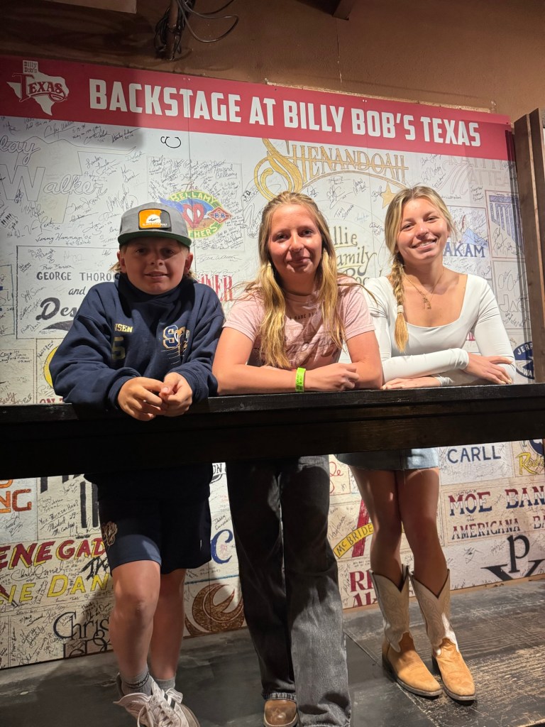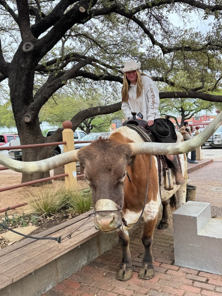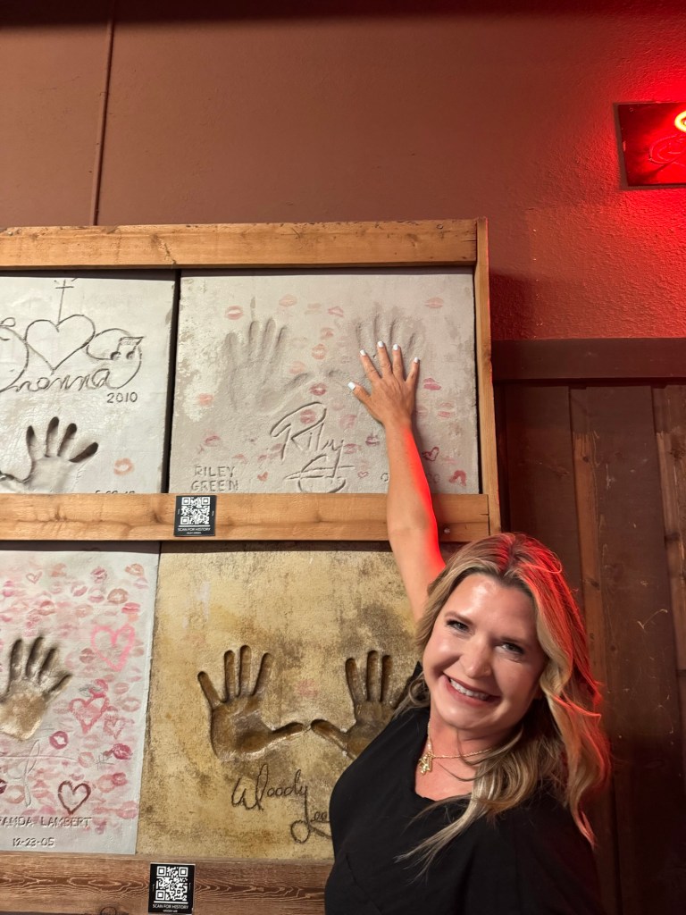 That night we stayed at Hotel Drover in Ft. Worth. It is an adorable hotel with an awesome western ambiance. If you have seen the show Landman, it was filmed there. After our pictures we watched the 11:30 cattle drive with the longhorns. Every day, there are two cattle drives at 11:30 and 4:00. Ft. Worth was the last stop before heading into a 600 mile trip to Kansas, so cattle drives were common here. It is a great photo op, a wonderful history lesson and on the weekends you can watch a shoot out, following the cattle drive. We were also able to meet up with my musician cousin Lauren here and explore an old record shop and see the folks she has played with and stop in at Billy Bobs to see all the handprints of the sold out shows. I loved placing my hands in Riley Greens and Lainey Wilson’s.