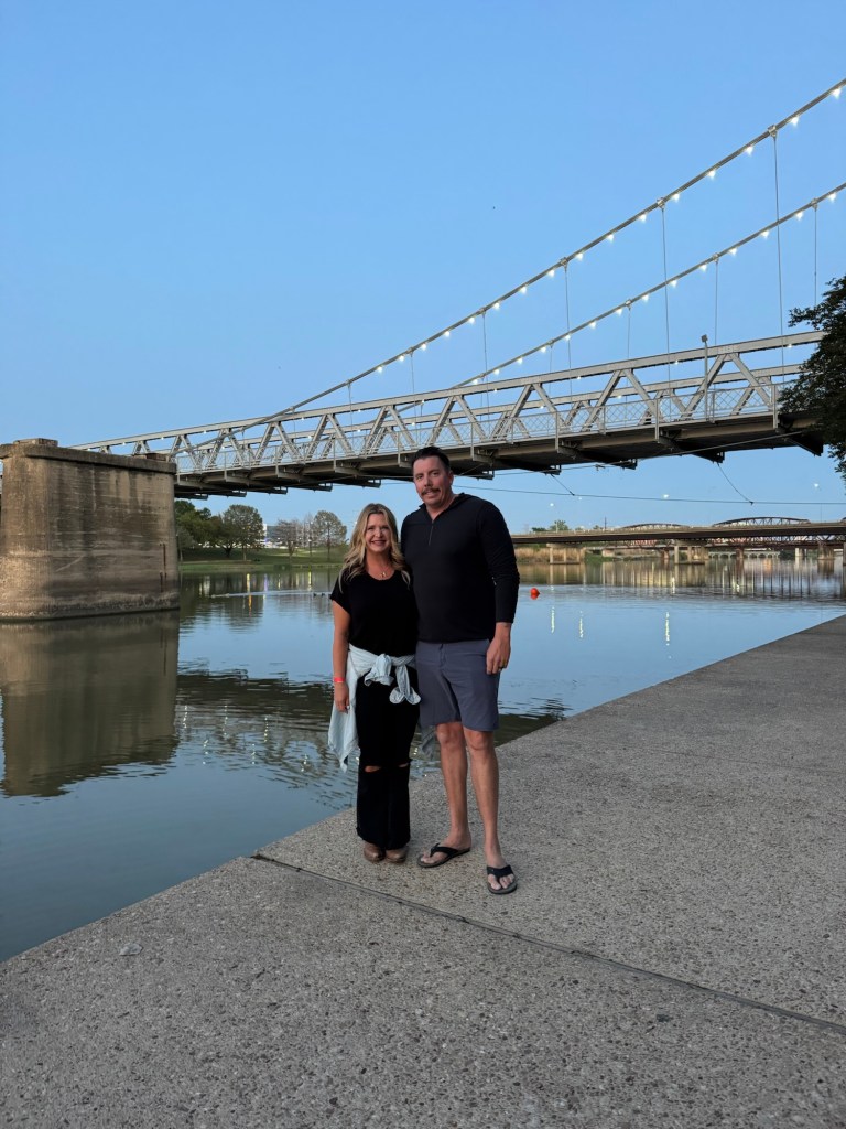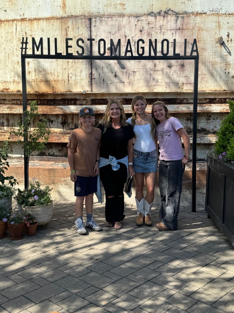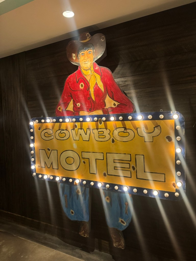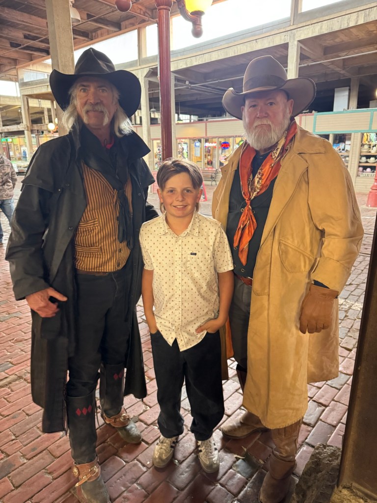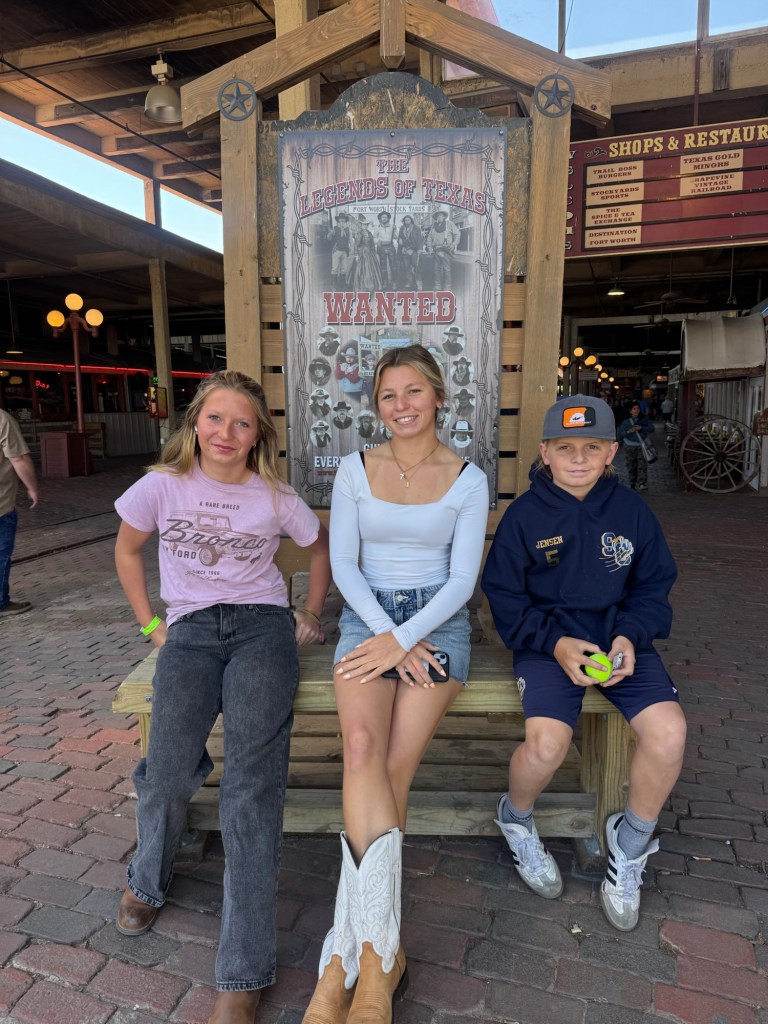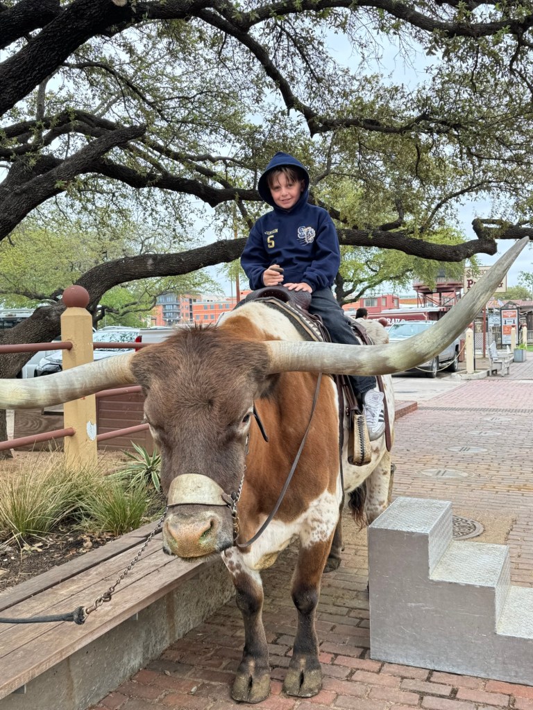 That night we stayed at Hotel Drover in Ft. Worth. It is an adorable hotel with an awesome western ambiance. If you have seen the show Landman, it was filmed there. After our pictures we watched the 11:30 cattle drive with the longhorns. Every day, there are two cattle drives at 11:30 and 4:00. Ft. Worth was the last stop before heading into a 600 mile trip to Kansas, so cattle drives were common here. It is a great photo op, a wonderful history lesson and on the weekends you can watch a shoot out, following the cattle drive. We were also able to meet up with my musician cousin Lauren here and explore an old record shop and see the folks she has played with and stop in at Billy Bobs to see all the handprints of the sold out shows. I loved placing my hands in Riley Greens and Lainey Wilson’s.