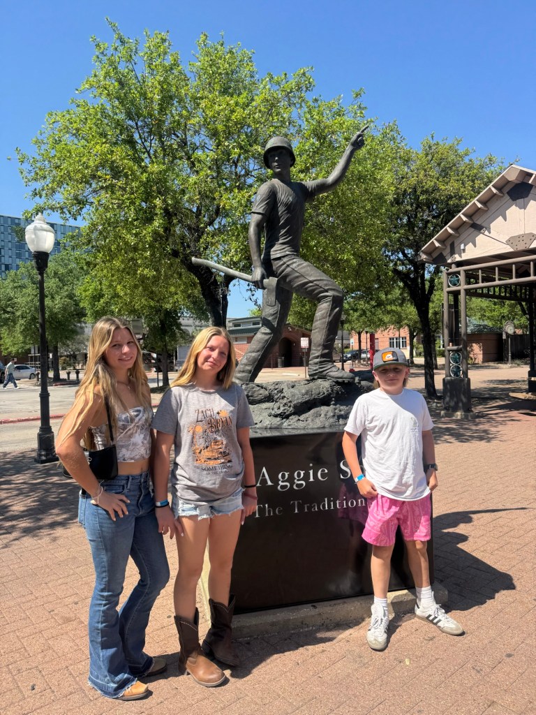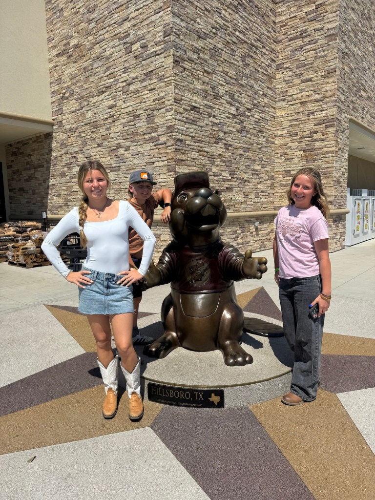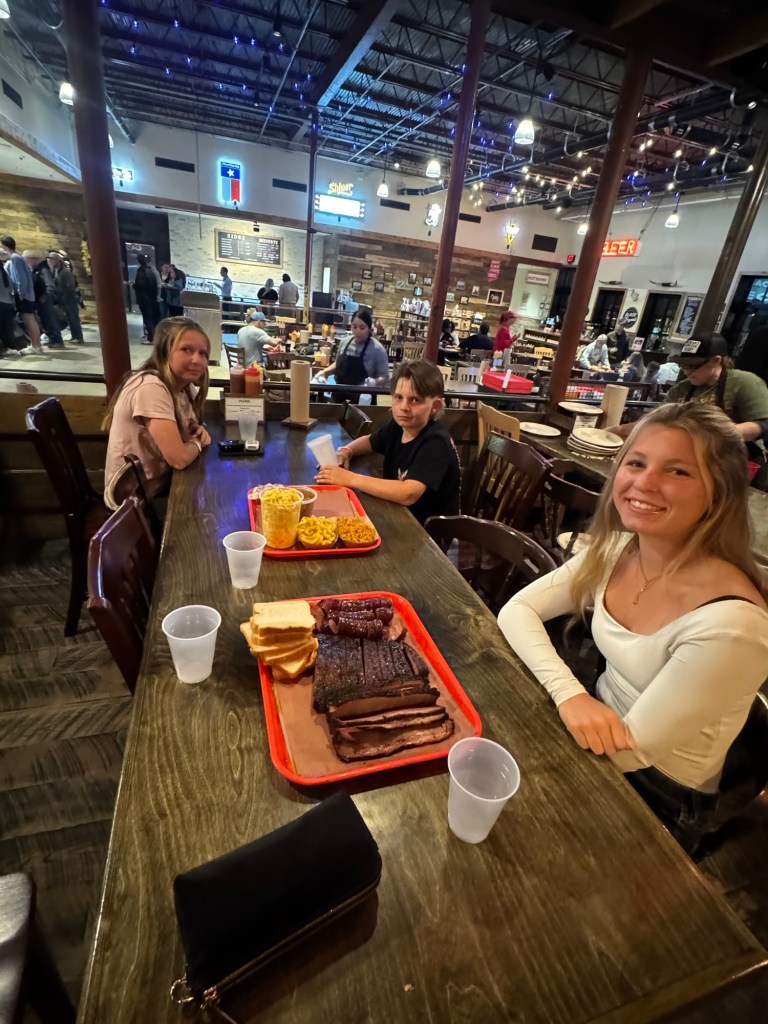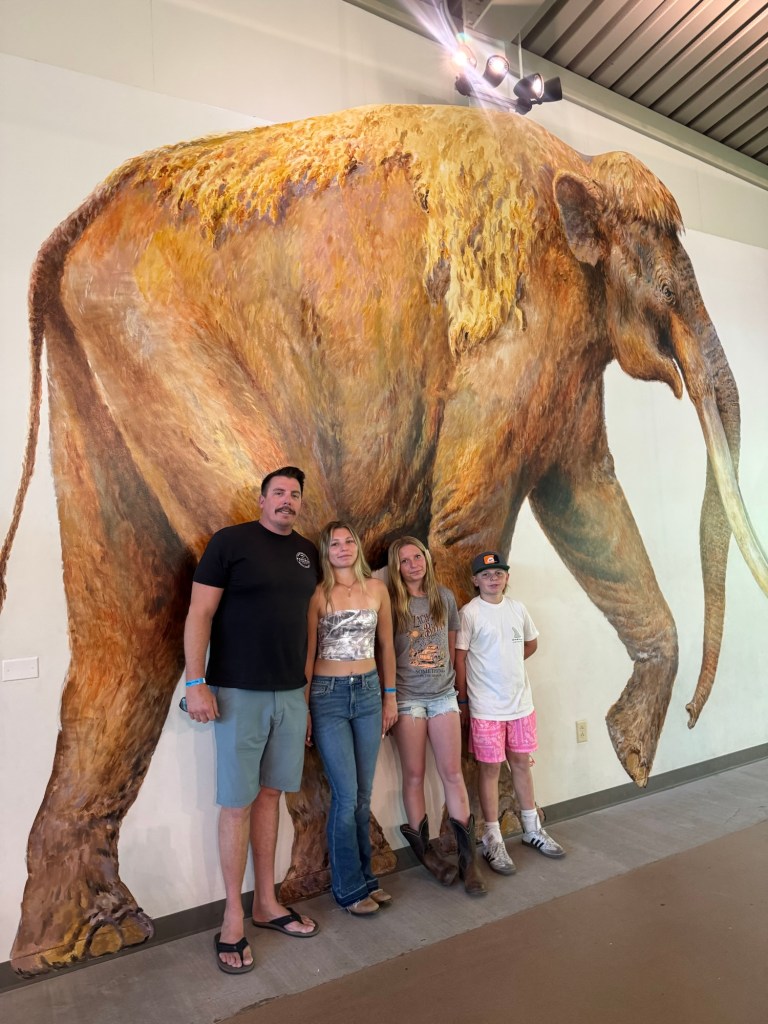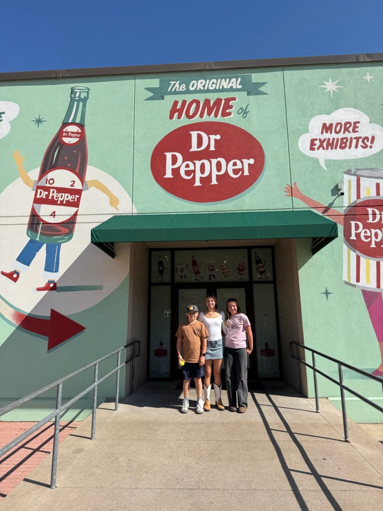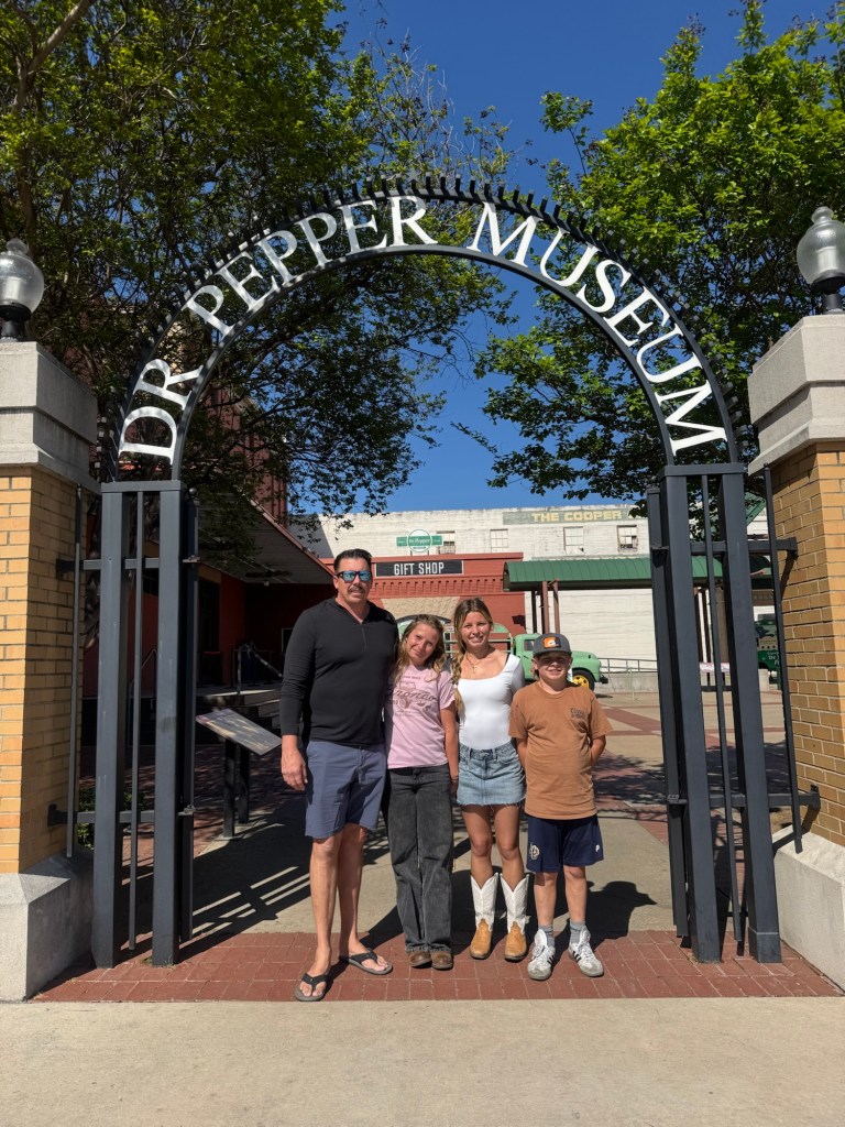 The next day we loaded up the Tahoe and headed to Waco. We stayed at the Residence Inn Waco in a two bedroom, two bathroom unit with a kitchen. They also offered breakfast, if you aren’t going to the Magnolia Silos for that! While in Waco we visited the Dr. Pepper museum and had Dr. Pepper floats, with the famous Blue Bell ice cream you see all over Texas. We actually had this ice cream at both stadiums, too. Of course we had to stop by the Magnolia Silos. While I shopped, the kids and my husband found a baseball diamond and used the wiffle bats and balls available to play. They also played corn hole and enjoyed the beautiful weather in the ample seating all over. That evening we went to the suspension bridge over the Brazos river and took sunset pictures (we have teenage daughters, if you know; you know). We had dinner at Terry Blacks BBQ and got the small family meal that serves six. It was so good, but much more than we could finish. Luckily, our hotel had a refrigerator and we had pork ribs and sausage as part of our breakfast. The next morning we grabbed a Dutch bros and headed to the Mammoth Fossil site. Colombian mammoths (not woolly mammoths) were discovered here by two boys trespassing and looking for arrowheads. When they found a bone, they took it over to Baylor University and realized there may be more and they found a group of mama and baby mammoths that may have been killed by a flood. It was one of the largest nursery burial grounds and was a short 30 minute guided tour and interesting. I feel like this museum was definitely much more worth the cost, than the Dr. Pepper museum, although it was a fun experience.